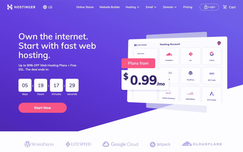 Hostinger is a global web hosting company known for very low introductory prices and solid performance for small to medium websites. Over the years, it has grown to offer a range of services from shared hosting and WordPress hosting to VPS and cloud hosting. It also includes useful extras like an AI website builder and free SSL certificates on most plans.